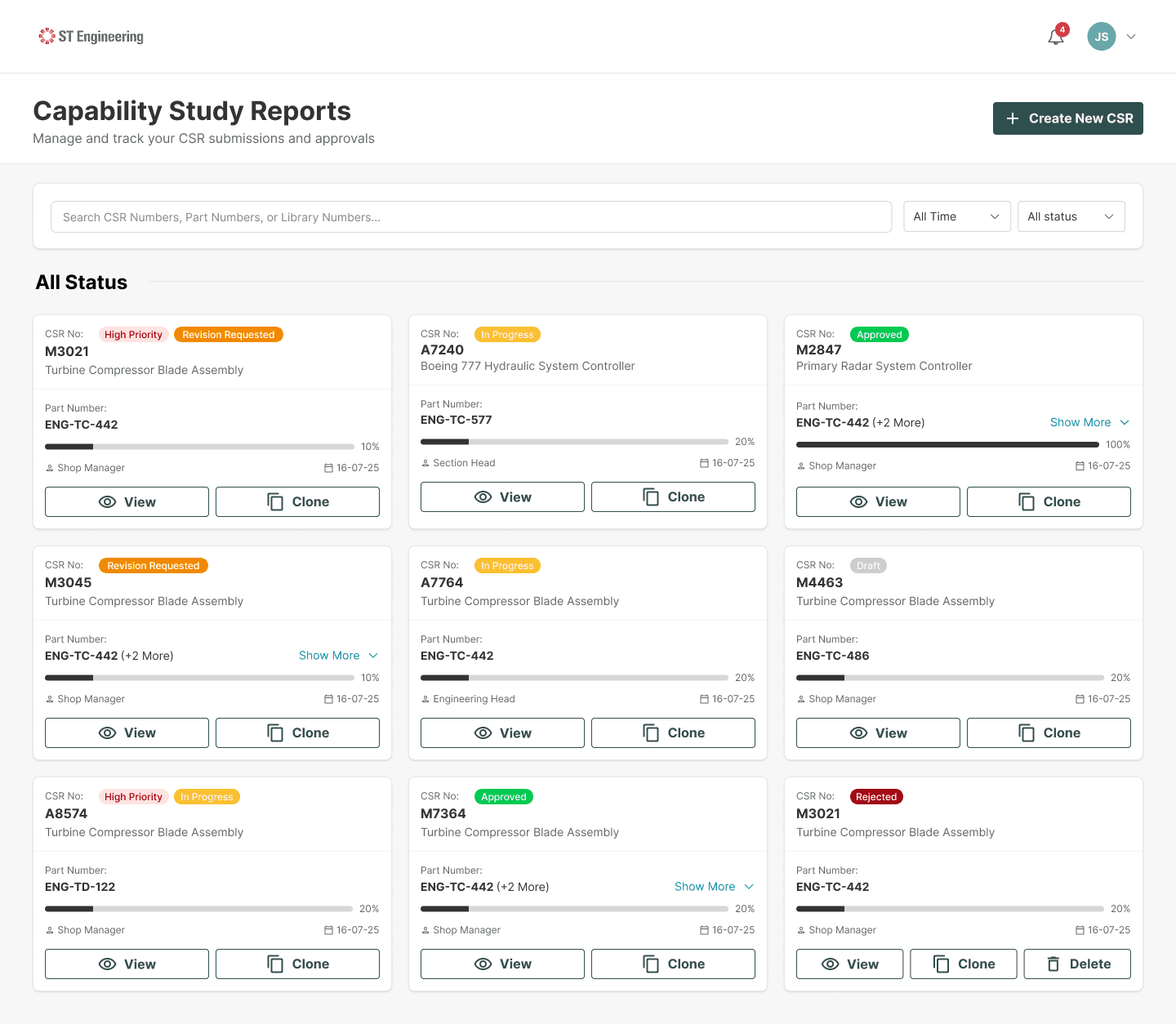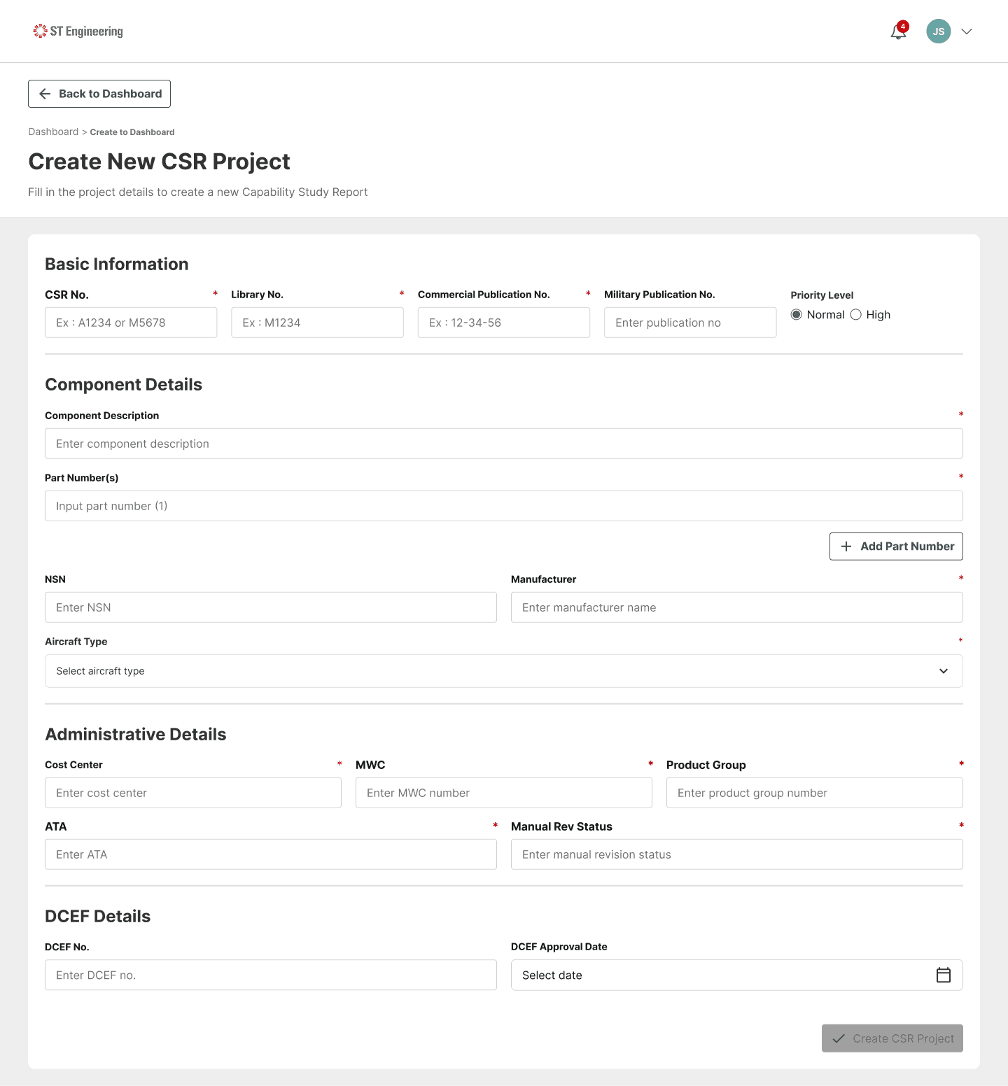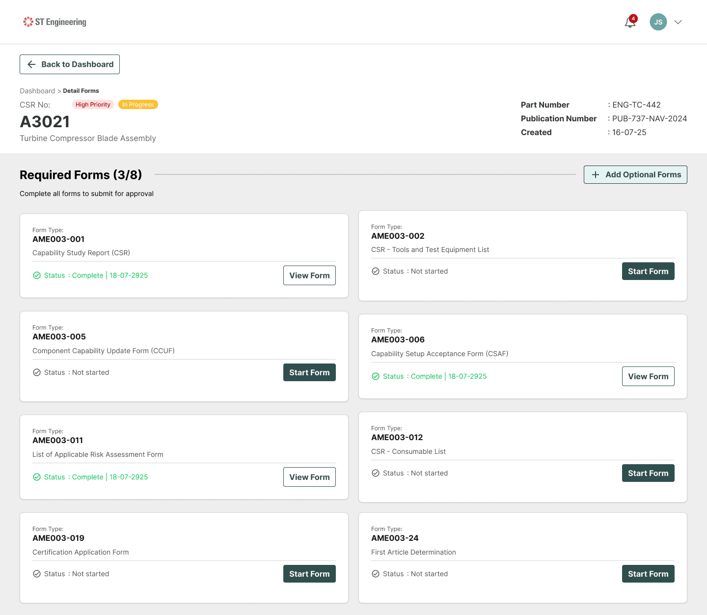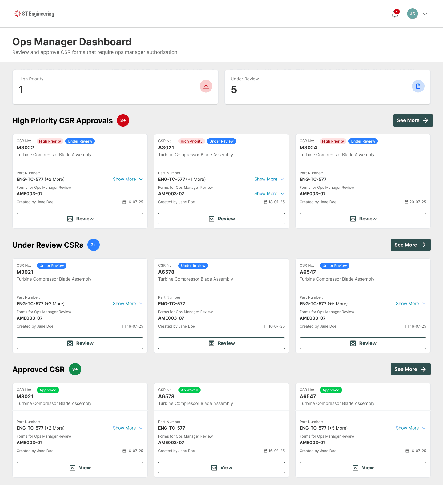 In this dashboard page, the Engineer expected to see all the CSR forms that they have created or need to be filled.