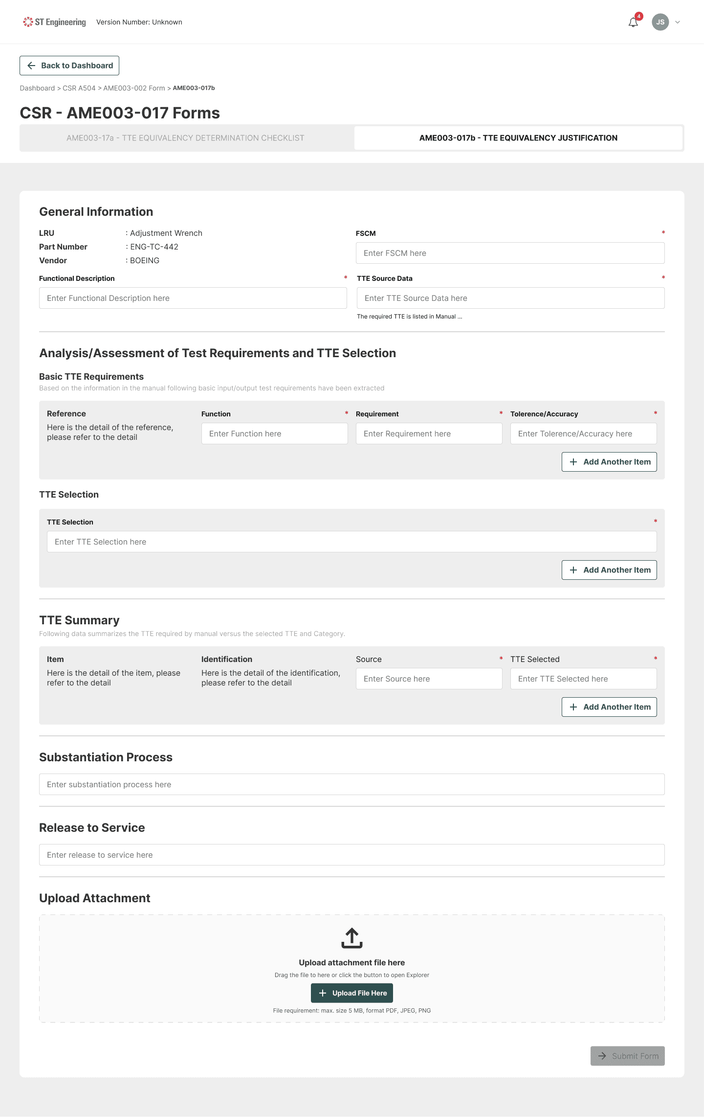 This is a page for the Engineer users to create a new capability form for do the maintenace. There are some fields that user need to fill it out before they can submit the form.